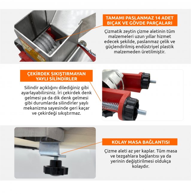 Kullanıcı dostu tasarımıyla ÇİZMATİK® Zeytin çizme aleti\\\\'nin kullanımı oldukça kolaydır. 14 adet paslanmaz çelik bıçaktan oluşan alet, çekirdek geldiğinde bıçakların geri saklanmasını sağlayan yaylı mekanizmaya sahiptir. Bu sayede onlarca kilogram zeytini kolay ve hızlıca çizebilirsiniz.