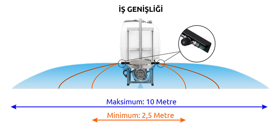 2 - 5 bar arası düşük basınçlarda kullanılmaktadır. Özel üretim ot ilaçlama nozulları olası çarpmalarda zarar görmeyecek şekilde profil içine gizlenmiştir.