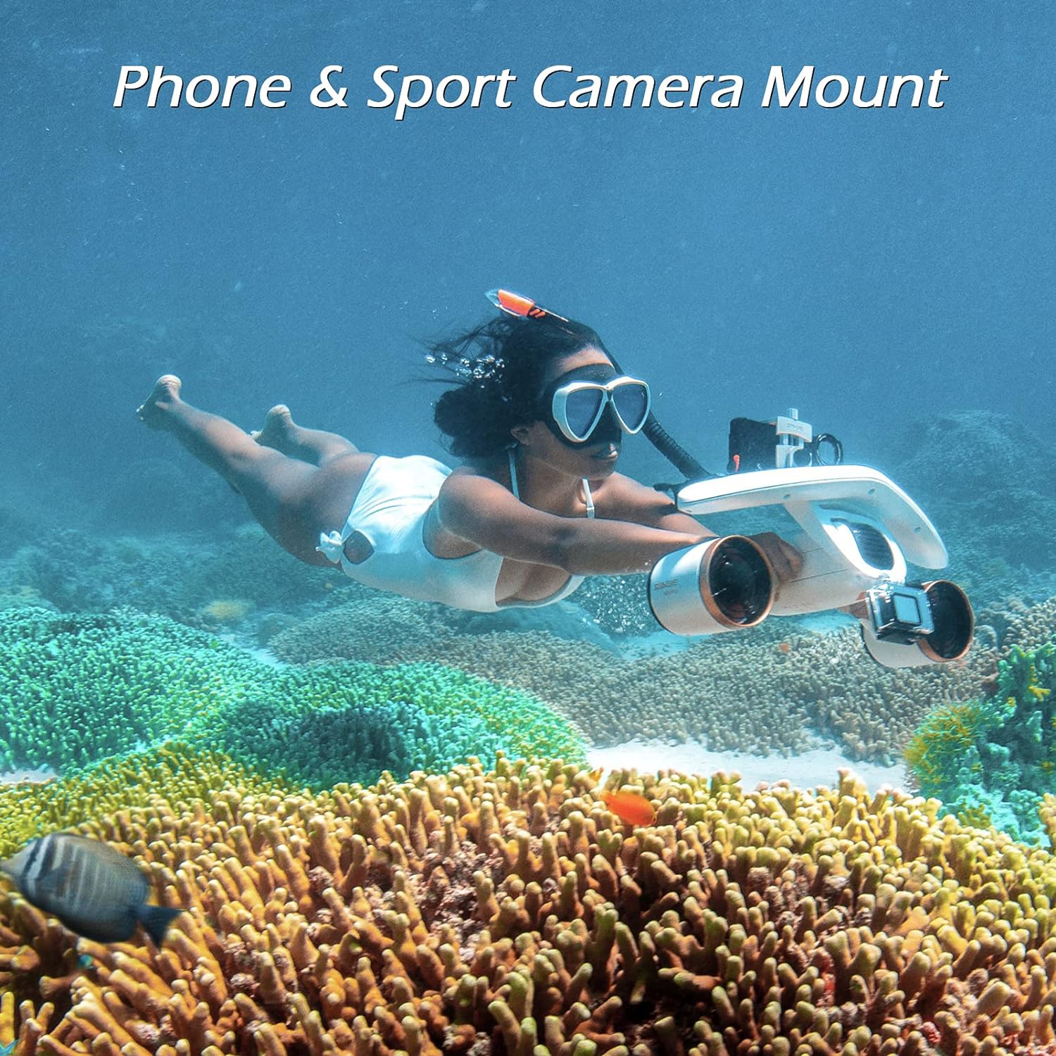 Şamandıra üzerinde bulunan belirlenmiş telefon yuvasına sabitleyerek akıllı telefonunuzu kullanarak destansı su altı anlarını yakalayın. WhiteShark MixPro'nuzu ek ekipman satın almanıza gerek kalmadan bir su altı kamerasına dönüştürmek için aksiyon kameranızı evrensel bağlantıya da takabilirsiniz. Ayrıca eğlence dolu aktivitelerinizi en üst düzeye çıkarmak için selfie uzatma çubuğu veya su geçirmez LED ışık gibi farklı aksesuarlarla uyumludur.